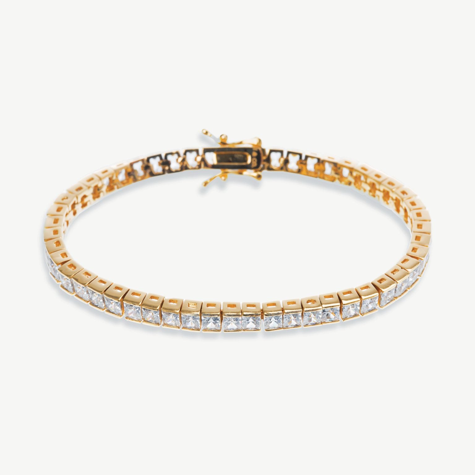 This is a very elegant tennis bracelet. Square cut stones are surround set and as this bracelet complements so many different style wedding gowns it is a very popular design. This delicate bracelet is understated and subtle but still sparkly and sophisticated. Features set Zirconia Crystals (Triple A rated simulated diamonds, facet cut for pure clarity and sparkle).