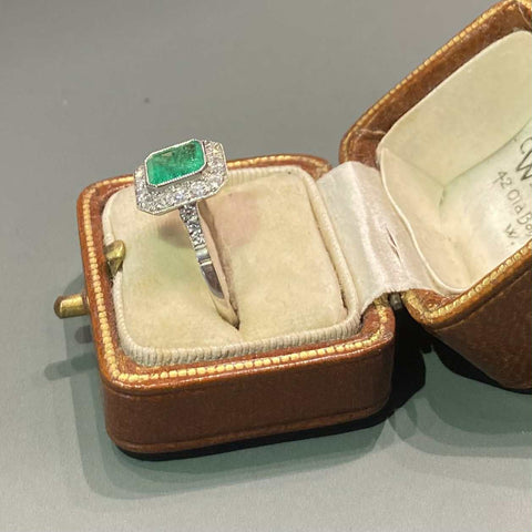 A beautiful natural emerald surrounded by round brilliant diamonds in a delicate platinum mount. Size O.