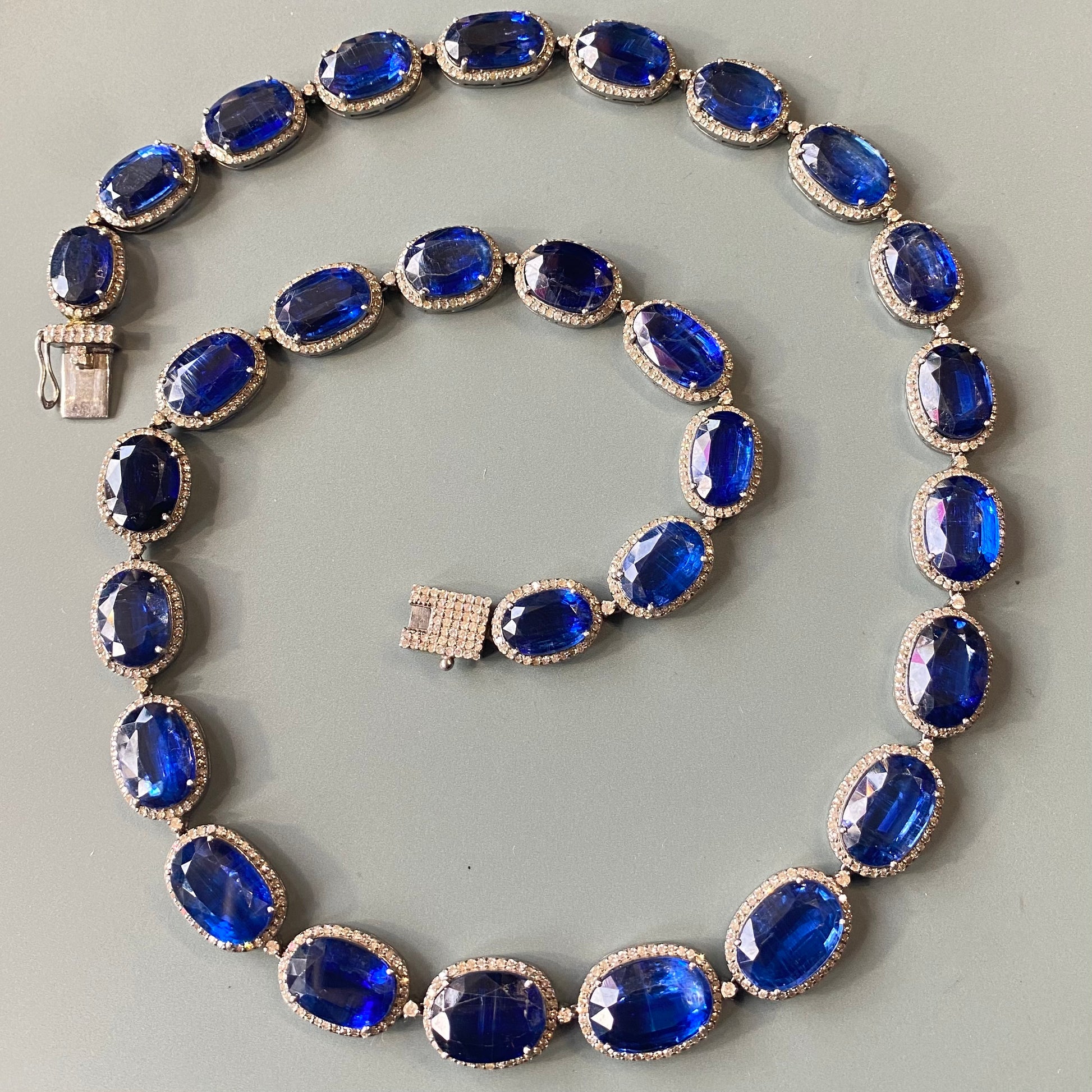 A fabulous bespoke handmade necklace and matching earrings set with vibrant faceted kyanite and Diamonds in an oxidised silver setting.