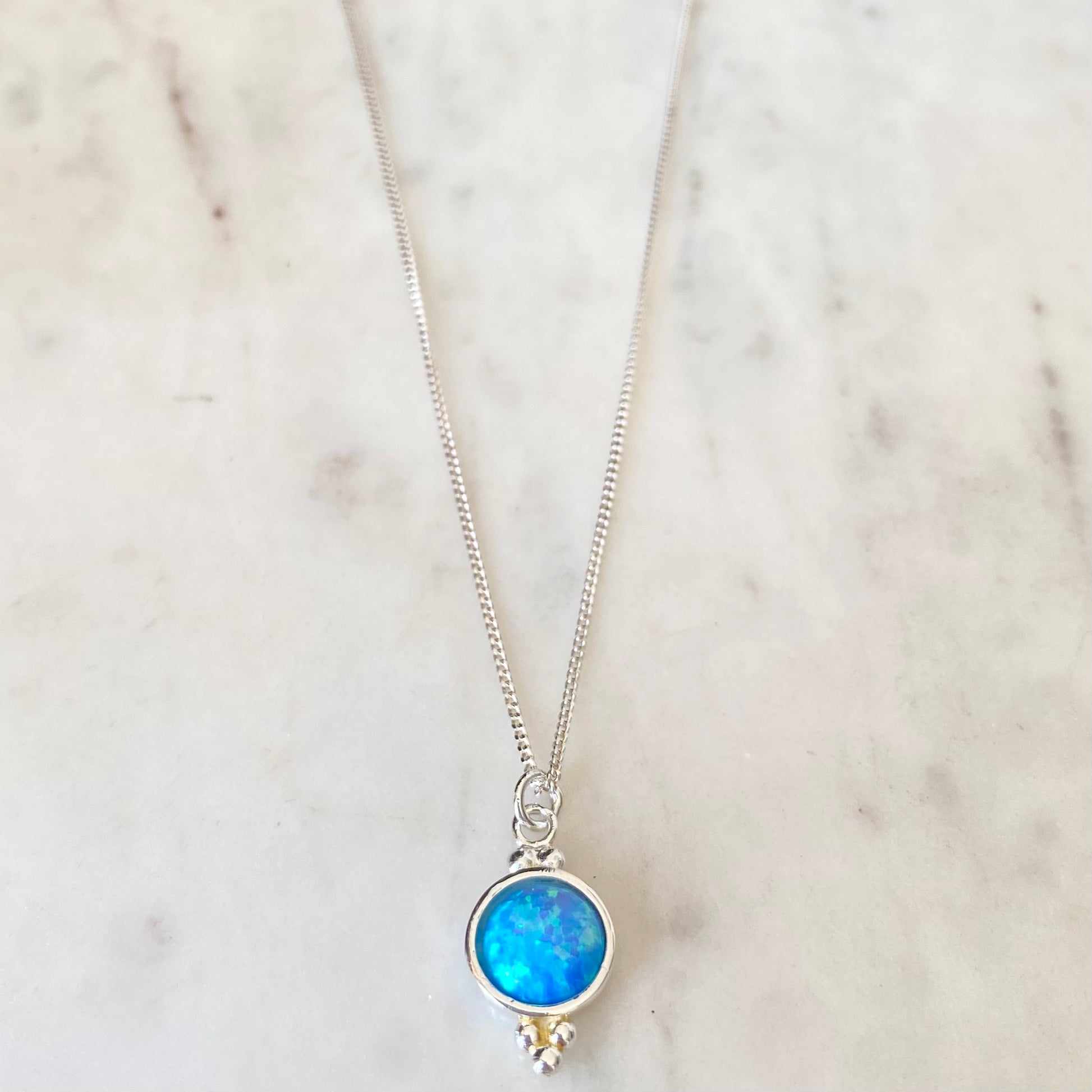 Circular shaped opal pendant with small sliver ball detailing above and below on a 18" sterling sliver chain.