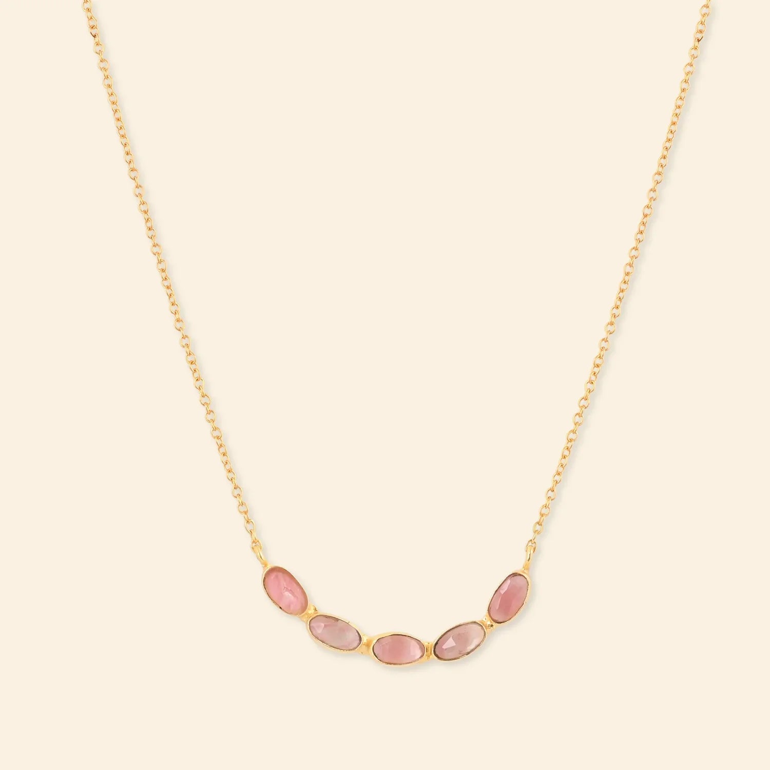 This necklace is plated with 18ct gold with gemstones in cherry crackle. The gemstones are in a uneven rose Cut