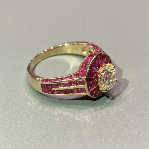 A superb quality Art Deco style ring. Mounted in 14ct yellow gold with 5.32 carats of calibre cut rubies and a 1 carat round brilliant cut diamond. The detail on this ring is just fabulous! Size M.