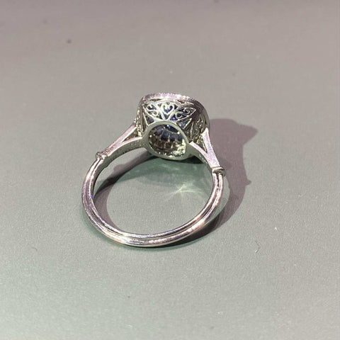 A super quality Art Deco style ring. Set with an Oval faceted sapphire surrounded by calibre cut sapphires and round brilliant cut diamonds.. All mounted in platinum. Centre sapphire is 1.13 carats. Size N.