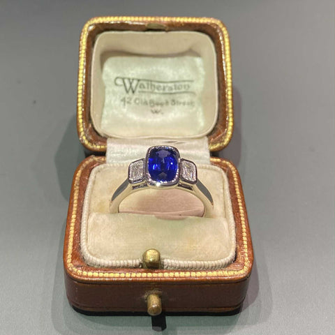 A beautiful blue sapphire set between two emerald cut diamonds all in a rub over setting. A very wearable ring in a super quality platinum mount. Size M.