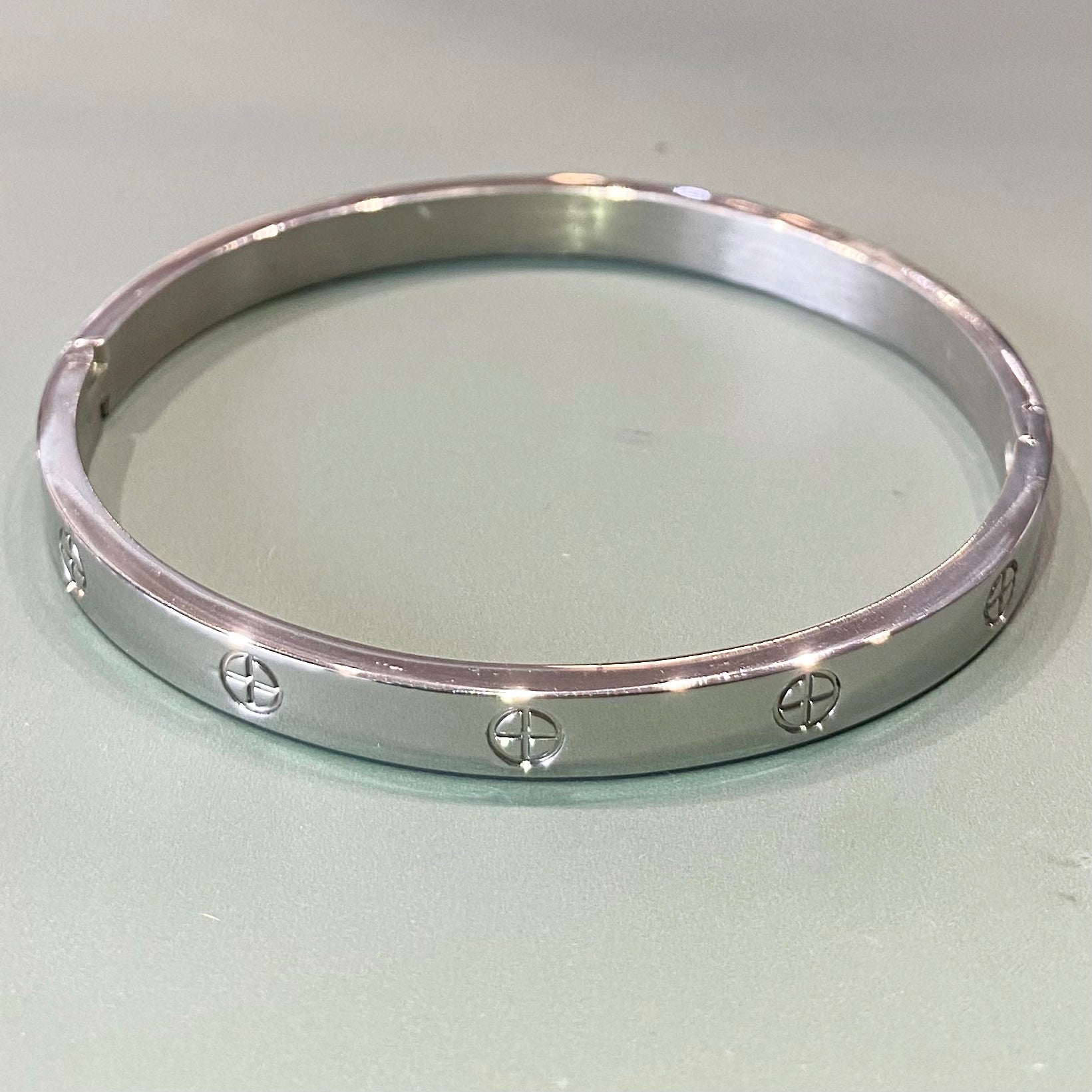 Made from Stainless Steel, this gorgeous style is inspired by the glorious screw bangle. It measures 16.5cm internal circumference and opened at one side so does not slide over the hand. 6mm depth. Waterproof and tarnish resistant.