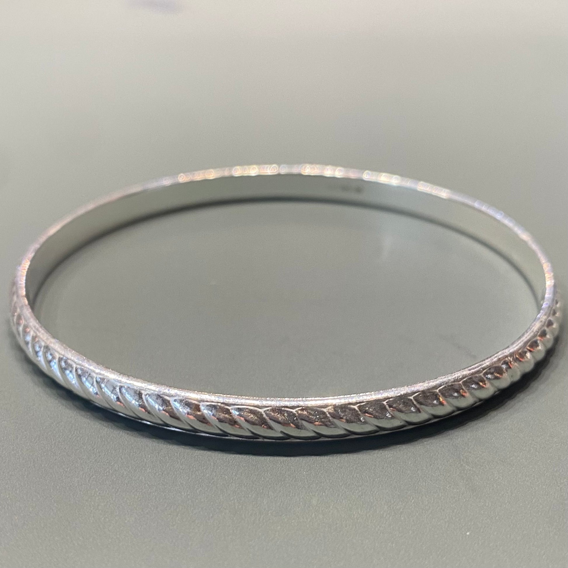 Solid sterling silver bangle with twist effect.