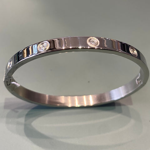 Made from Stainless Steel, this gorgeous style is inspired by the glorious Designer Love Bangle with embedded crystal detail. It measures 19cm internal circumference and opens at one side so does not slide over the hand. 6mm depth. Waterproof and tarnish resistant.